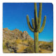 The photograph features a large multi-armed saguaro cactus by a hiking trail which leads toward a boulder strewn mountain in the Sonoran desert.