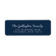 Navy blue return sticker with script names and a dotting of stars, designed to coordinate with Lea Delaveris Design's star baby shower invitation collection