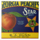Display a piece of vintage art on a decorative tile. This tile is adorned with the Star Brand Georgia Peaches fruit crate label with a large image of a peach on the tree and a gold star with an indian head Georgia Peach Growers Exchange Logo on a green circle; all in front of a dark blue background. Use this tile as a trivet or a decoration in your home or kitchen. Add a wooden frame to enhance the design and give it a larger surface area for a hot pan or use to hang the tile on the wall. The design has been enlarged to fill the entire print area to stylize the label design. If you wish to see the whole label, click "Customize It!" and use the controls to size the art to your liking. A little history of the Fruit Crate Label. From around 1880 to 1940, the western United States experienced the beginning of nearly seventy-five years of intense competition among fruit growers to create the most colorful, artistic and eye catching paper crate labels used to identify their citrus fruit crates. German immigrants combined their printing and illustration skills to create fruit crate commercial art unsurpassed anywhere in the world. German Americans for decades had been using lithography to create labels for wine bottles. California orange growers and shippers adapted the wine label concept to a larger format and fruit crate labels were born. Originally, the process used to create the labels was and is known as stone lithography, where the illustration was etched directly on a piece of limestone; a process requiring great talent and skill. Fruit crate labels from the 1880's through the 1920's were mostly produced by this stone lithographic process. More modern printing techniques were used after this period until the 1940's and 1950's when wooden crates and labels were mostly replaced with preprinted cardboard boxes. Today, fruit crate labels are highly collectible and recognized as an outstanding example of commercial art and illustration from a bygone era.