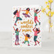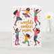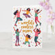This greeting card features an off-white background with a large, warm golden-orange message centered prominently, drawing your eye right away. Around the words, six stylized women in bright outfits—fuchsia, sunny yellow, leafy green, and deep violet—move like they’re celebrating together, their closeness reading as friendly and affectionate ❤️. Some are shown mid-leap with arms wide, while others dance in place, as if cheering each other on with big open-mouthed smiles. Their hair is mostly dark, worn long and flowing or gathered into tidy buns, adding variety while keeping the group cohesive. Several wear quad roller skates in spirited reds and cool teals, and patterned leggings add extra detail to their looks. The lettering sits in the middle with generous spacing around it, making the surrounding figures feel like they’re circling the message in support 👩. Scattered around the scene are small multi-pointed stars in goldenrod, blush pink, and soft teal, along with a sprinkling of dark dots.