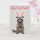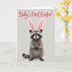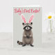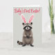 This card shows a cute, upright woodland animal that looks like a young raccoon, drawn in soft grays and warm beige with a gentle smile and fine white whiskers. Dark facial markings frame its bright eyes, which glance forward with a friendly, affectionate look, as if sharing a quiet moment with the viewer 🌷. On its head sits a fun headband with tall bunny ears 🐰, colored coral-pink with a thin white outline and sprinkled with tiny star-like shapes. Its small front paws are held together in a shy clasp, adding to the sweet, companionable mood. Across the upper area, the phrase “Baby’s First Easter!” appears in flowing, cursive-style lettering in a rich pink that matches the ears. The text is centered near the top and leaves plenty of space so the character remains the main focus. The background is a smooth, pale gray field with no other objects, making the coral-pink ears and pink headline stand out clearly. The bunny ears rise above the character’s head like two tall coral-pink shapes edged in white against the light gray backdrop.