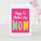 This card features a rich fuchsia background that fills the front like a bright stage for a family celebration. Near the top, a line of flowing white lettering sits centered and reads like an opening note before the main message. Below it, the word “MOM” appears in large, chunky letters that feel affectionate and close, like a hug in print ❤️. The first “M” is mint green with small dots and crisp white stars, giving it a sweet, childlike sparkle. The “O” is red with white vertical stripes and has a red heart perched above it, like a gentle sign of love between close family or friends. The last “M” matches the dotted-and-starred pattern but shifts to a warm yellow, adding a sunny, caring glow 🌼. Small flowers in orange, yellow, and teal are sprinkled around the letters, and the white stars stand out sharply against the mint and yellow shapes.