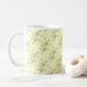This pretty floral mug features a repeating abstract pattern of the lovely spring perennial garden plant known as Star of Bethlehem (Ornithogalum umbellatum). Each flower has six white petals and a yellow center.
