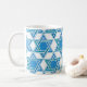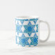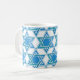 A stylish white Coffee Mug with an all-over Star of David pattern in blue, green and white, from a handpainted design by Judy Adamson.