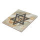 The rustic ceramic tile features a Star of David with the Hebrew word "chai", meaning "life". The metal ornament, gold and marble stone effects are digitally created. The stunning coaster or trivet adds an elegant touch as a decorative display piece in any room.