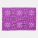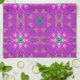 This towel's design reminds me of the 70's. It is a geometric pattern consisting of diamonds, circles, and squares in shades of purple. There are stars interspersed throughout the design.