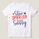 A lively and patriotic design featuring the phrase "Star Spangled and Sassy" in bold, dynamic text. The words "Star" and "Sassy" shine in blue, while "Spangled" and "and" pop in red, creating a striking contrast. Scattered red and blue stars enhance the festive, spirited vibe, making this design perfect for celebrations, apparel, or anyone looking to showcase their fun, confident patriotism.