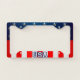 This patriotic license plate frame inspired by the American flag features alternating red with white stripes, and silver stars over a blue background.