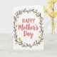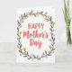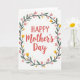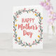 This card features coral-red lettering in the center that reads “HAPPY Mother’s Day,” with “HAPPY” in uppercase and “Mother’s Day” in a flowing cursive style, creating a sweet, affectionate contrast ❤️. The words sit neatly inside a circular wreath that feels like a gentle hug around the message. Deep emerald leaves form the main ring, giving the design a steady, grounded frame. Soft pink blossoms and small yellow flowers are spaced around the greenery like little nods of care, as if each bloom is placed with someone special in mind 🌼. Tiny golden starburst accents are sprinkled between petals and leaves, adding a light sparkle without crowding the page. The white background stays open and airy, letting the colors breathe and keeping everything easy to read. The wreath is evenly balanced all the way around, with the gold starbursts tucked into the gaps between the flowers and the dark green leaves.