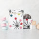 This wrapping paper has a mid-century modern design of starbursts scattered all over with circles on the end