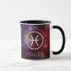 Show off your personality with this simple but striking mug, which features the stylized astrological character for Pisces, the twelfth sign in the Western zodiac, encircled by four key traits of those born under the symbol of the fish and rendered on a starfield painted with polychromatic stardust across the black velvet night! Add your personality traits to your sign, and adjust filters and fonts as desired! Reverse shows identical design.