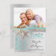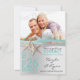 Silver and aqua starfish and ribbon beach theme save the date card with photo. Personalize text as preferred.