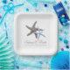 Starfish couple wedding paper plates. Brown and blue sea star images represent the couple in this design on square, white paper plates. Customize two lines of text with names of the couple and one more line of text. The sample wording is, “The adventure begins - with date”. Use at casual pre-wedding showers and parties, or to serve cake at the reception.