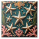 Vintage carved tile with an underwater scene of starfish flanked by seaweed, pink coral and topped with a golden floral ornament on a dark sea green background.