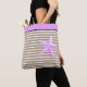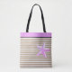 This tote bag is shown in a cute sand color stripes and a large Pink starfish print design with coordinating Pink top band. Black strap handles.