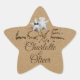 A charming beach scene featuring a starfish couple created from sparkling gemstones—one adorned with a veil, the other with a bow tie. The design includes sand-carved “Love” typography on a sandy background, personalized with the couple’s names. A sweet keepsake or gift sticker for beach weddings. Shown in a star-shaped design with additional shapes available.