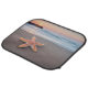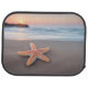 A picture of an orange starfish lying on the sandy part of a beach. Sunset background.