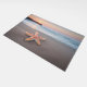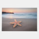 A picture of an orange starfish lying on the sandy part of a beach. Sunset background.