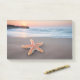 A picture of an orange starfish lying on the sandy part of a beach. Sunset background.