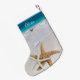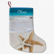 Tropical themed Christmas stocking, printed on both sides with a beach scene and big starfish. Choose to hang facing right or left, and use the name template accordingly. Delete the name sample not needed, or put the same name on both sides. Turquoise sea water and beach sand cover both sides.