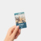 Personalized name badge with a scenic photo. A big starfish set upright on a sandy beach. A beautiful blue sea with waves of white surf in the background.