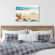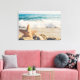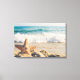 Canvas print with a scenic photo. A big starfish set upright on a sandy beach. A beautiful blue sea with waves of white surf in the background.