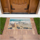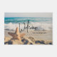 Welcome doormat with a scenic photo. A big starfish set upright on a sandy beach. A beautiful blue sea with waves of white surf in the background.