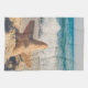 A kitchen towel with a scenic photo. A big starfish set upright on a sandy beach. A beautiful blue sea with waves of white surf in the background.