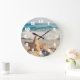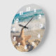 A clock with a scenic photo. A big starfish set upright on a sandy beach. A beautiful blue sea with waves of white surf in the background.