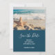 Save the date card with a scenic photo. A big starfish set upright on a sandy beach. A beautiful blue sea with waves of white surf in the background.