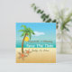 Palm tree and starfish tropical beach destination wedding Save the Date announcement showcasing a tropical beach with a palm tree with coconut on the sand with starfish, blue sea/ocean water and the sky with the sun and clouds.