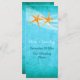 Starfish pair and veil turquoise tropical destination beach wedding menu card featuring a couple of orange starfish on a white waved veil on turquoise blue and teal grunge stained background. This modern aqua wedding design is part of a wedding set or wedding collection and is a fully customizable template perfect for a destination beach summer wedding.