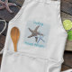 Personalized starfish kitchen aprons. White, full length, bib apron with two, brown and blue starfish, and three lines of template text for adding a name and "beach kitchen".