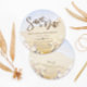 These custom save-the-date cards bring forth an irresistibly tropical vibe with their stunning starfish design. Perfect for a beach-themed wedding, these cards are crafted lovingly by Mylini Design, a designer renowned for their experience and finesse in creating elegant wedding stationery. The cards are fully customizable to match your wedding color scheme or theme. They also offer the convenience of personalized text, ensuring your cards turn out exactly as you envisioned. If you need any help with the customization or require matching items, feel free to reach out and our team will be more than happy to help. Don't hold back; buy now and check one more thing off your wedding to-do list. Take the first step towards your dream tropical wedding with these beautiful custom save-the-date cards by Mylini Design.