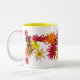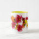 Brighten your day with this cheerful mug which features a colorful design of stargazer dahlias in brilliant colors of pink, yellow, orange, gold, fuschia and maroon on a pure white background. More dahlias are scattered inside. They are called stargazers because, unlike the traditional dahlia, the petals have a pointy star shape.