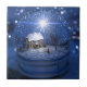 Inside a snow globe is a winter landscape with a cottage overshadowed by bare maple and cherry trees. In the windows of the little house candles burn, and on the lawn a Christmas tree sparkles with red and gold. It's an evening at Christmastime, and the lights of a thousand tiny stars fill the globe, with one great Christmas star filling the night with its rays, while the warm beams from inside the cottage light up the surrounding landscape.