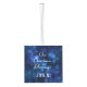 This elegant cube ornament has your own photographs on the front and back. Between the photos on the remaining sides is a pretty dark blue and silver bokah style star pattern background. On the right is a silver swirl Holiday tree image. The left and right sides have text fields in silver for you to customize...make it say whatever you'd like! The top and bottom also show the blue pattern background, but without the text. A wonderful annual keepsake for your family!