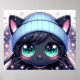 This adorable anime-inspired kitten, adorned with a beanie and sparkling, wide eyes, exudes cuteness and whimsy against a backdrop of twinkling stars and soft pastel hues.