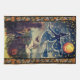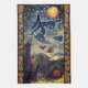 Halloween kitchen towel showing a witch flying across a starry night sky over fields with pumpkins, a black cat, and an owl. The witch is outlined in stars. This is from a vintage 1913 Halloween design.