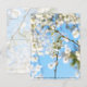 A branch with a fully bloomed white Magnolia flower. A budding branch lingering over it. And a background of many blooming branches up against a blue sky. Photograph Copyright ©2022 Kimberly J Tilley. zazzle.com/store/developingnature