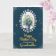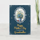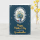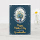 This card features a deep, star-dusted blue background that sets a calm, night-sky mood. Near the top, an oval window is outlined with delicate white curling lace-like details, drawing your eye inward. Inside the oval, a full bouquet mixes rich blue rose-like blooms with pale blue petals and small yellow daisy-like flowers, nestled among layered green leaves for a cozy, caring feel ❤️. The flowers sit in a classic blue-and-white ceramic vase, and a single bright red blossom peeks out near the base like a little secret between loved ones. Beneath the oval, the message “Happy Mother’s Day to my beloved Grandmother” is centered, with “Happy Mother’s Day” in warm golden-orange lettering and the rest in white. The text sits on the lower portion of the design, leaving generous space around it so the words feel gentle rather than crowded 🌼. Fine white scrollwork frames the bouquet above, while tiny star specks scatter across the blue background.