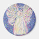 The art shows a soft pastel angel against a soft blue starry night background. The image was initially painted with acrylic and then finished in pastel to create soft luminous color.