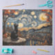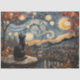 A black cat gazing at a swirling star-filled night sky above a quiet village.