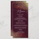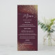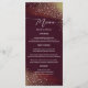 Enchant your wedding guests with the 'Starry Night Deep Crimson Wedding Menu.' This menu embodies sophistication with its deep crimson backdrop, overlaid with a dusting of golden star-like specks that suggests a cosmic allure. It's a perfect reflection of an enchanted evening wedding, combining celestial wonder with modern simplicity. The clear, elegant typography adds a contemporary edge, ensuring that the details of your carefully chosen appetizers, main courses, and desserts are both readable and aesthetically pleasing. This menu card is not just a guide to the culinary journey your guests will embark upon—it's also a keepsake of a night under the stars, celebrating love and commitment.