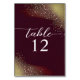 The 'Starry Night Deep Crimson Wedding Table Number' is an elegant navigational touch to your wedding décor. The card features a rich, deep crimson background that graduates to a luminous golden hue, reminiscent of a starlit sky transitioning to dawn. A constellation of delicate golden specks scatters across the top, adding a touch of cosmic wonder. The table number is prominently displayed in a stylish font, providing clear guidance with an air of sophistication. These cards not only serve a practical purpose in seating arrangements but also enhance the celestial theme of your wedding, making each table part of a larger, starry night tapestry.