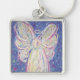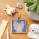The art shows a soft pastel angel against a soft blue starry night background. The image was initially painted with acrylic and then finished in pastel to create soft luminous color. Customized this white light guardian angel art keychain pendant with your own text and images to make personalized special angel keychain charm gifts!
