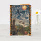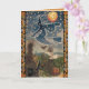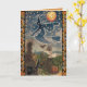 This Halloween card shows a starry night with a witch outlined in stars flying across the sky over fields of pumpkins. The design is from a 1913 Halloween card.