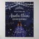 Personalize this lovely starry night quinceañera birthday welcome sign poster with your own wording easily and quickly. Simply click the "Edit Using Design Tools" button to modify the text, wording, font style, font size, and font color. You can also add or remove text, and move or remove images. The princess girl and crown are movable, resizable, duplicatable, and removable, allowing you to customize the design to suit your occasion.