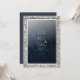 This card is a sophisticated and elegant wedding invitation that conveys a sense of luxury and romance. The theme is inspired by a starry night, with a dark background and white streaks that create a contrast and a sparkle effect. The card is framed by a glittery gold border that adds to its richness and glamour. The text is written in a stylish, cursive font that matches the elegance of the theme. The names of the bride and groom are highlighted in larger letters, while the details of the date, time, and location are provided below. The card also includes an RSVP note at the bottom right corner, inviting guests to respond to the invitation.
