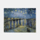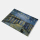 Thatched Cottages at Cordeville. Vincent Willem van Gogh. Night landscape in dark blue and yellow tones. There is a bridge across the river. In the foreground, a man and a woman are walking along the embankment. The stars are shining in the sky. Reproduction of famous works of art images in the public domain.